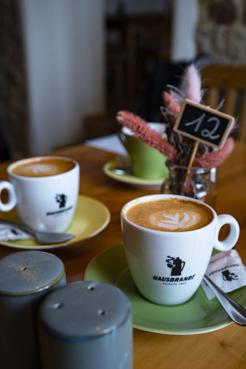 Der ländliche Stil des Gastraumes lässt die die Jahrhunderte, die das Gebäude bereits überdauert hat, erahnen. Geschreinerte Möbeln treffen auf modernen Elemente und vereinen sich schließlich zu einem eigenen, in sich stimmigen, Stil. Wir machen’s uns an unserem Tisch Nr. 12 gemütlich, bestellen dreimal Kaffee zum munter werden und starten in familiär-entspannter Atmosphäre allmählich in den Tag.